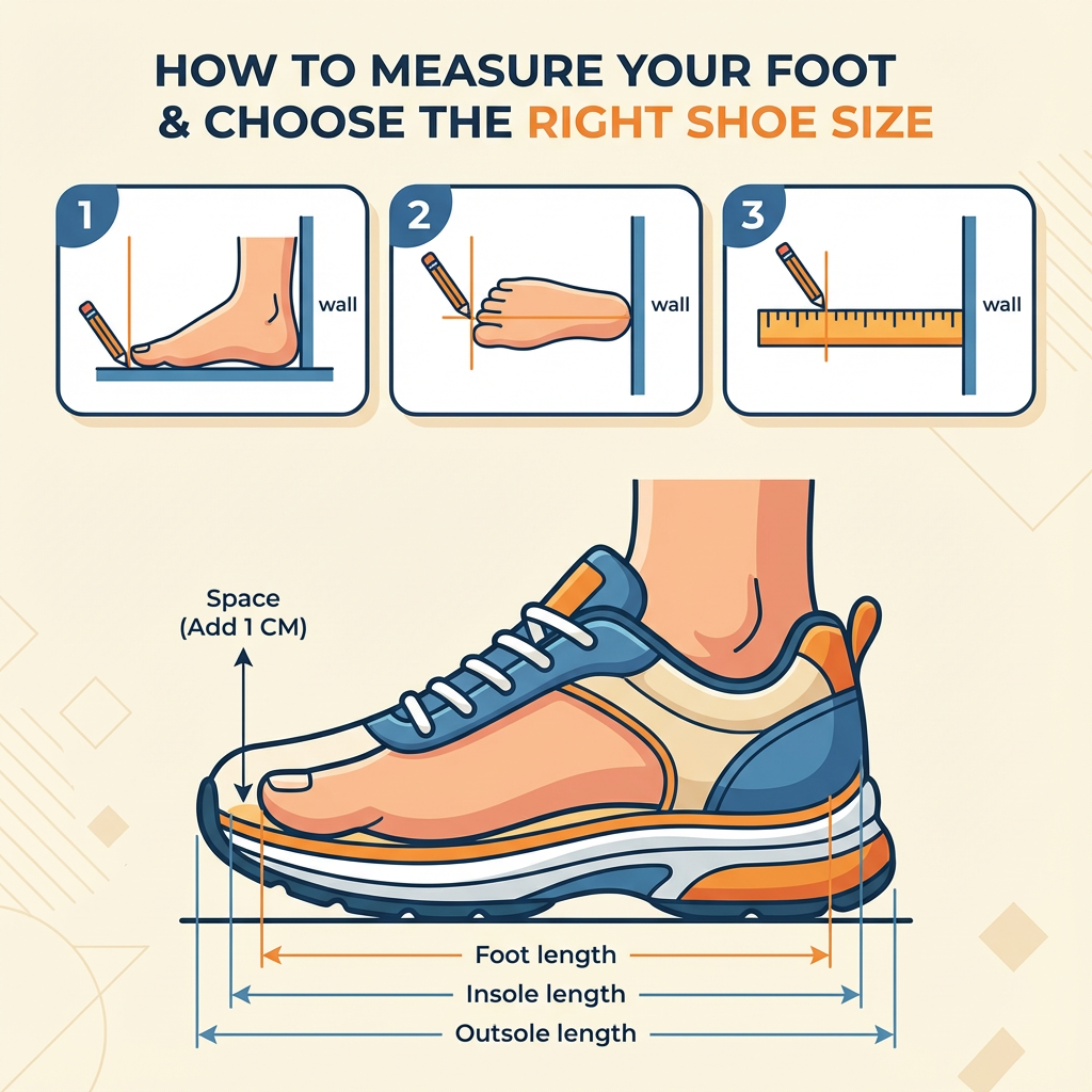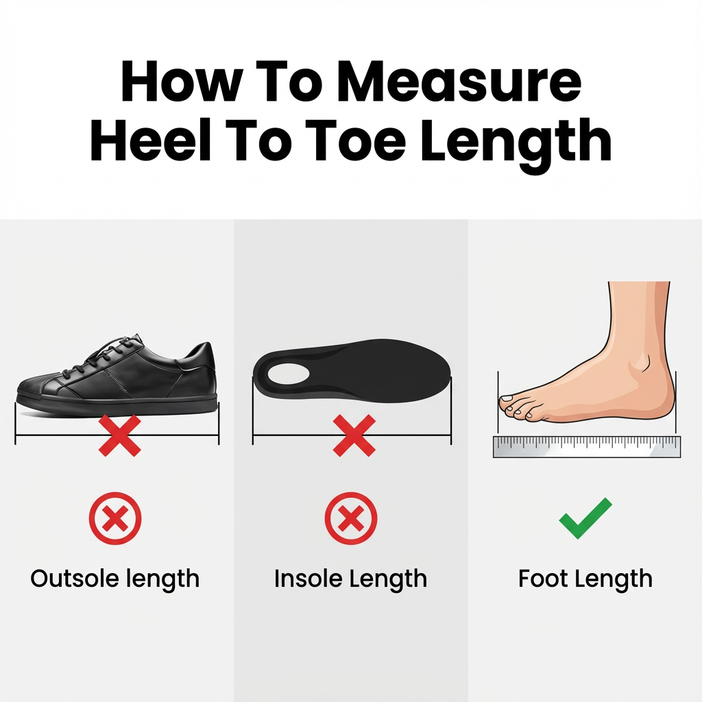 Place your foot flat on a piece of paper and mark the tip of your longest toe and the back of your heel.